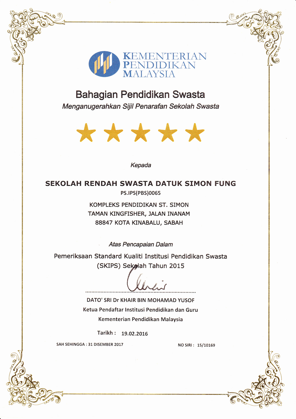 SRS Datuk Simon Fung was awarded 5-Star Quality Standards Award for Private Education Institution or Anugerah Standard Kualiti Institusi Pendidikan Swasta (SKIPS). The award is based on the Ministry’s assessment of 10 criteria including Establishment and Registration, Institutional Management, Curriculum Management, Teaching and Learning Assesment, Examination Management, Teacher’s Management and Development, Discipline Standards, Cleanliness and Cheerfulness, and Teaching Management. The 5-Star rating award is the highest available and awarded to the institutions with high results. The SKIPS award confirmed that SRS Datuk Simon Fung is the best private school in Sabah and its commitment to exceptional education.